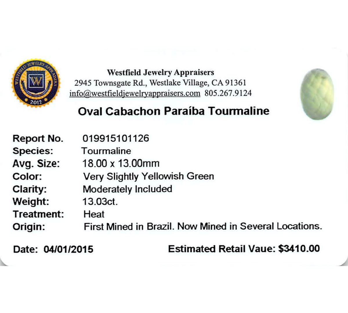One oval cabochon cut natural Paraiba tourmaline exact weight 13.03ct., clarity is moderately included, cut is good. Westfield Appraised at $3,410.00.