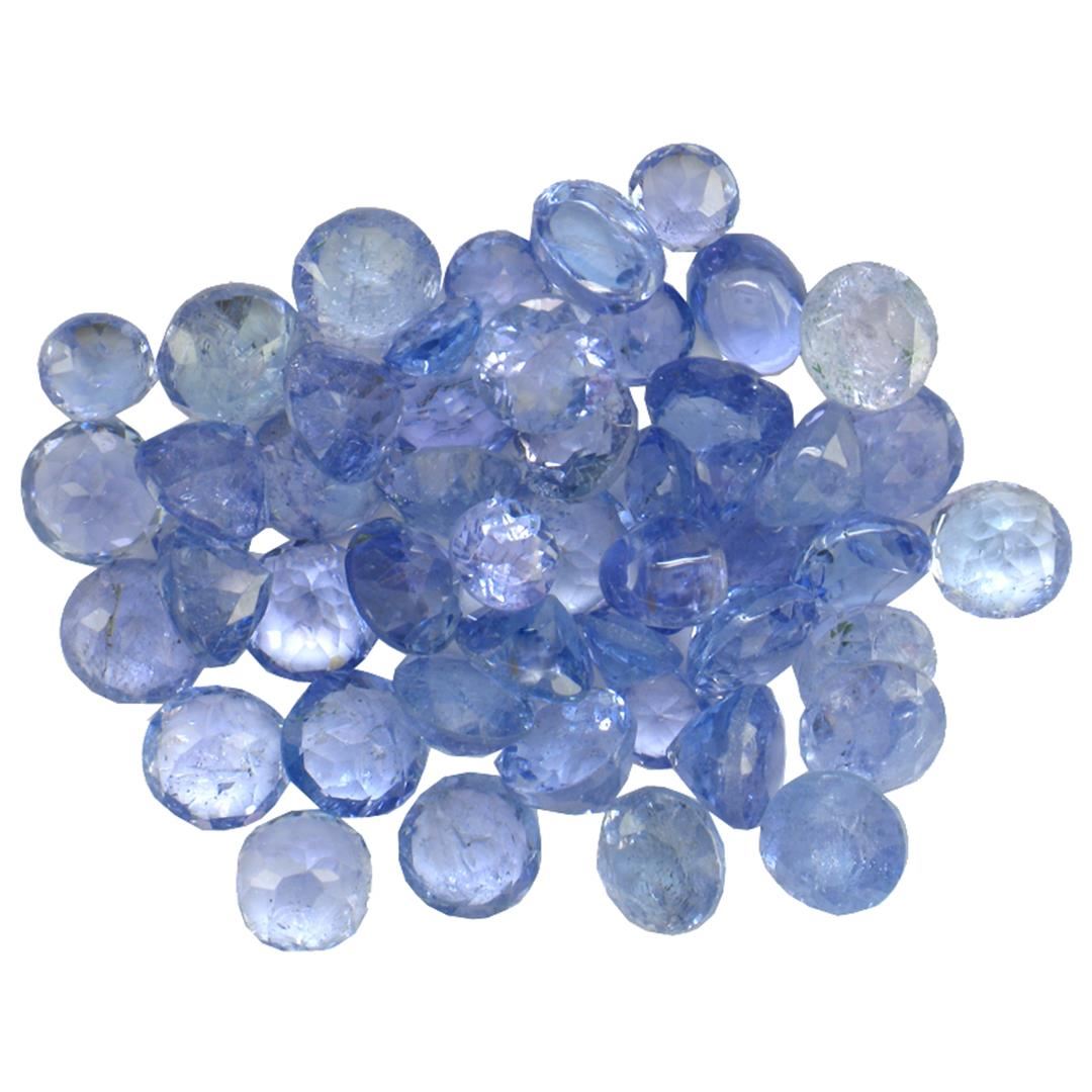 Forty-five round mixed cut natural tanzanites exact total weight 13.03ct., clarity is slightly included, type I, medium dark, very slightly grayish, bluish violet color, (GIA bV 6/3), cut is good. Transmitting light with a minimum of distortion, transparent. Naturally occurring internal & external characteristics are present. Color grade is an average for the group. Tanzanite is a very rare gemstone that is only found in the country of Tanzania. Originally discovered in 1967. Tiffany & Company, named the stone Tanzanite. It is found in the Usumburu Mountains that border the Umba Valley of northern Tanzania. Tanzanite occurs in gray, brown, violet, blue, reddish-purple, & green. The gem is interesting because of its exceptional pleochroism. Rotated in different directions a tanzanite will exhibit multiple changes of color. Tanzanite has a low tolerance to ultrasonic cleaning, and should not be cleaned using this method. Westfield Appraised at $1,255.00.