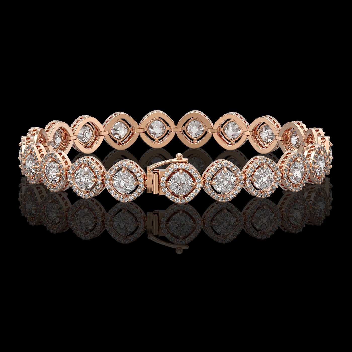 REF-2253W3F -42807 ---- 13.06 CTW Cushion Cut Diamond Designer Bracelet 18K Rose Gold ---- Luxury Designer Brand Bracelet Appraised at $99,150 Certificate Number US42807 18K Rose gold, Bracelet Size is 7 Inches, Bracelet measuring approx. 8 mm x 7 Inches, weighing in total approx. 20 grams. Made in the USA and is stamped 18K, Main stone 9.87 carat total weight containing 21 pieces of I-J color with VS/SI quality Cushion shape cut Diamond , Stone #2 3.19 carat total weight containing 399 pieces of G-H color with VS/SI quality Round shape cut Diamond
