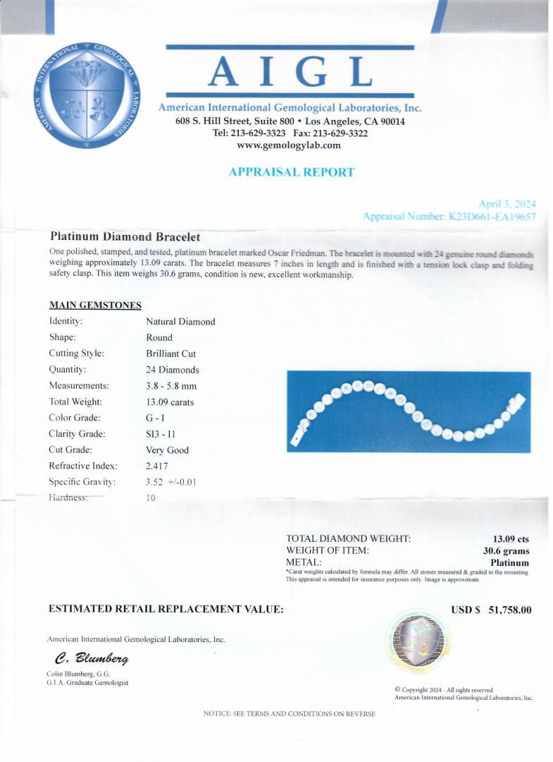One polished, stamped, and tested, platinum bracelet marked Oscar Friedman. The bracelet is mounted with 24 genuine round diamonds weighing approximately 13.09 carats. The bracelet measures 7 inches in length and is finished with a tension lock clasp and folding safety clasp. This item weighs 30.6 grams, condition is new, excellent workmanship. #MAIN GEMSTONES# Identity: Natural Diamond Shape: Round Cutting Style: Brilliant Cut Quantity: 24 Diamonds Measurements: 3.8 - 5.8mm Total Weight: 13.09 carats Color Grade: G-I Clarity Grade: SI3-I1 Cut Grade: Very Good Refractive Index: 2.417 Specific Gravity: 3.52 +/-0.01 Hardness: 10 TOTAL DIAMOND WEIGHT: 13.09 cts WEIGHT OF ITEM: 30.6 grams METAL: Platinum Size: 7