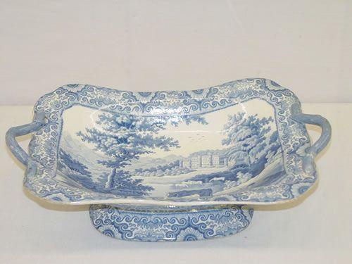 13 1/2" BLUE & WHITE STAFFORDSHIRE PEDESTAL FRUIT COMPOTE W/ OPEN HANDLES-ENGLISH RURAL SCENE W/ COWS - WEAR