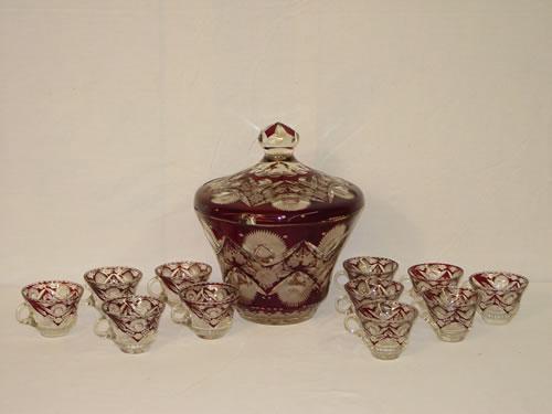 13 1/2" BOHEMIAN RUBY CUT TO CLEAR PUNCH BOWL W/ COVER & (11) HANDLED PUNCH CUPS, UNMARKED - (4) CUPS HAVE VERY SMALL NICKS