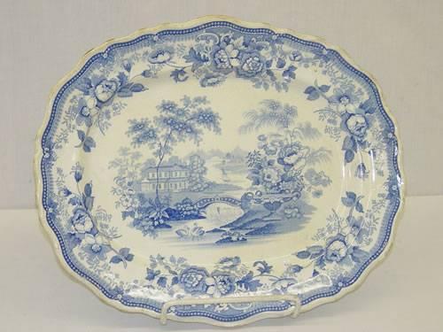 13 1/2" LIGHT BLUE STAFFORDSHIRE PLATTER - ROYAL COTTAGE W/ IMPRESSED ANCHOR MARK - 2" RIM CRACK;