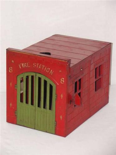 13 1/4" KINGSBURY PRESSED STEEL FIRE STATION W/ CLOCKWORK MECHANISM (NOT WORKING) - GOOD PAINT W/ MINOR LOSS;