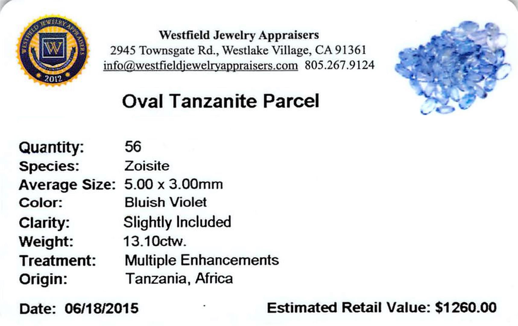 Fifty-six oval mixed cut natural tanzanites, measuring 5.00 x 3.00 x 1.95mm, exact total weight 13.10ct., clarity is slightly included, type I, medium, very slightly grayish, bluish violet color, (GIA bV 5/3), cut is good. Transmitting light with a minimum of distortion, transparent. Naturally occurring internal & external characteristics are present. Measurements & the color grade are an average for the group. Tanzanite is a very rare gemstone that is only found in the country of Tanzania. Originally discovered in 1967. Tiffany & Company, named the stone Tanzanite. It is found in the Usumburu Mountains that border the Umba Valley of northern Tanzania. Tanzanite occurs in gray, brown, violet, blue, reddish-purple, & green. The gem is interesting because of its exceptional pleochroism. Rotated in different directions a tanzanite will exhibit multiple changes of color. Tanzanite has a low tolerance to ultrasonic cleaning, and should not be cleaned using this method. Westfield Appraised at $1,260.00.