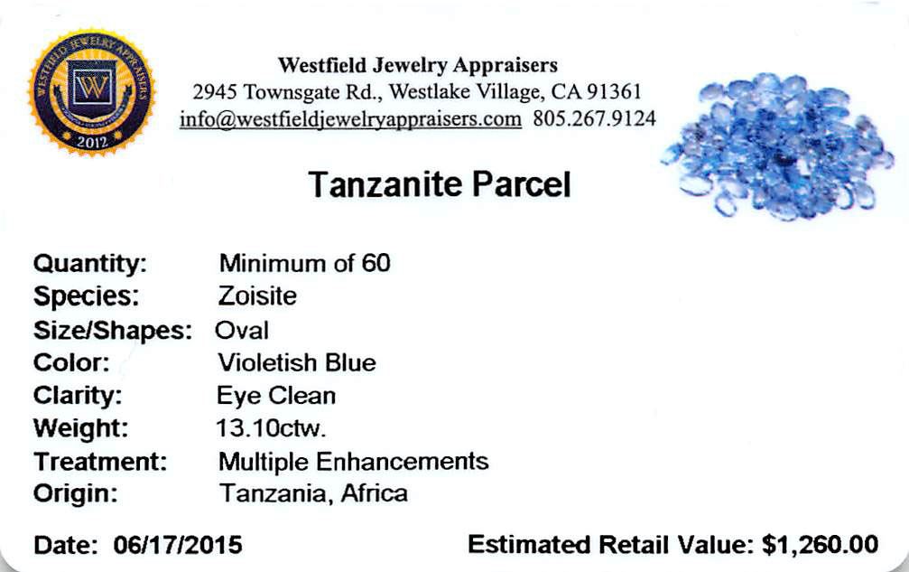 Sixty oval mixed cut natural tanzanites exact total weight 13.10ct., clarity is slightly included, type I, medium dark, very slightly grayish, violetish blue color, (GIA vB 6/3), cut is good. Measurements & the color grade are an average for the group, Color grade is an average for the group, Transmitting light with no distortion, transparent, Indications of laboratory high temperature heat treatment. Westfield Appraised at $1,260.00.