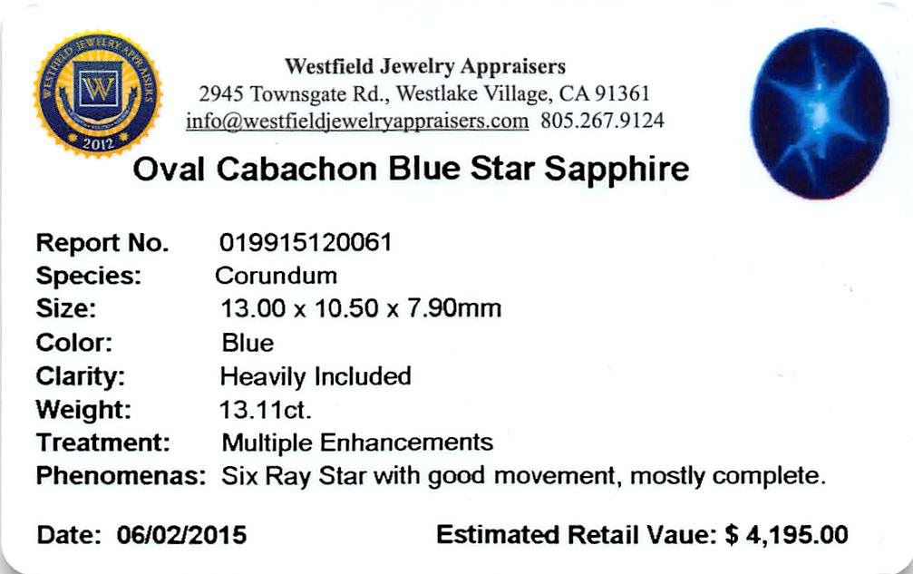 One oval cabochon cut natural blue star sapphire, measuring 13.00 x 10.50 x 7.90mm, exact weight 13.11ct., clarity is heavily included, dark, very slightly grayish, blue color, (GIA B 7/3), cut is good. This stone has a mostly complete six ray star with medium intensity and good movement Transmitting light diffusely, translucent to opaque. Naturally occurring internal & external characteristics are present. Indications of multiple laboratory enhancements, including high temperature heat treatment. Westfield Appraised at $4,195.00.