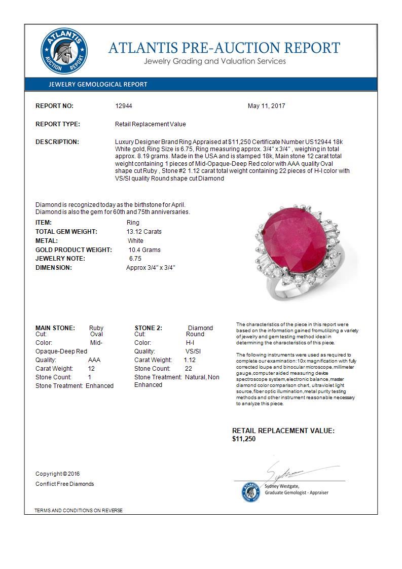 13.12 CTW Ruby & Diamond Ring 18K White Gold ---- Luxury Designer Brand Ring Appraised Retail Price at $11,250 ---- SKU Number US12944 18k White gold Ring Size is 6.75, Ring measuring approx. 3/4" x 3/4" , weighing in total approx. 8.19 grams. Made in the USA and is stamped 18k, Main stone 12 carat total weight containing 1 pieces of Mid-Opaque-Deep Red color with AAA quality Oval shape cut Ruby , Stone #2 1.12 carat total weight containing 22 pieces of H-I color with VS/SI quality Round shape cut