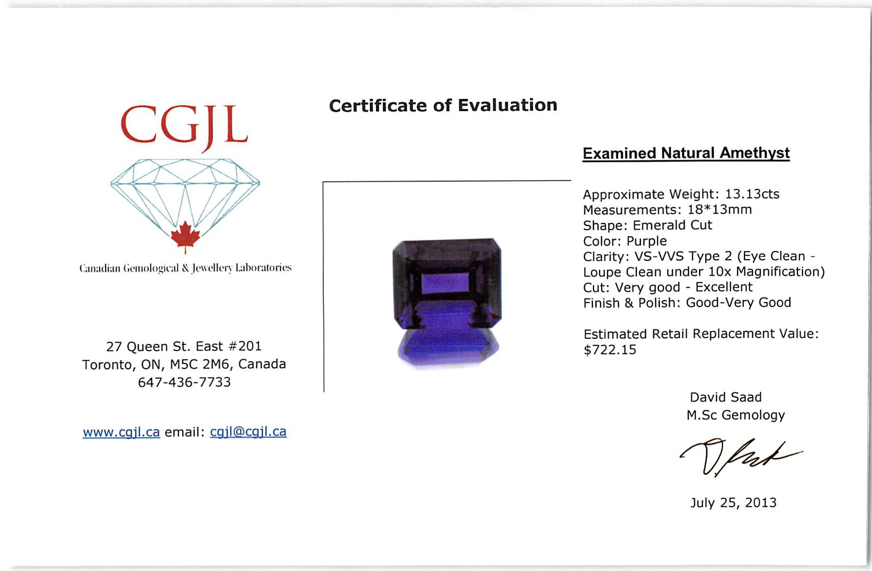 One 13.13ct Amethyst Emerald Cut Gemstone. Measures 18mm x 13mm.