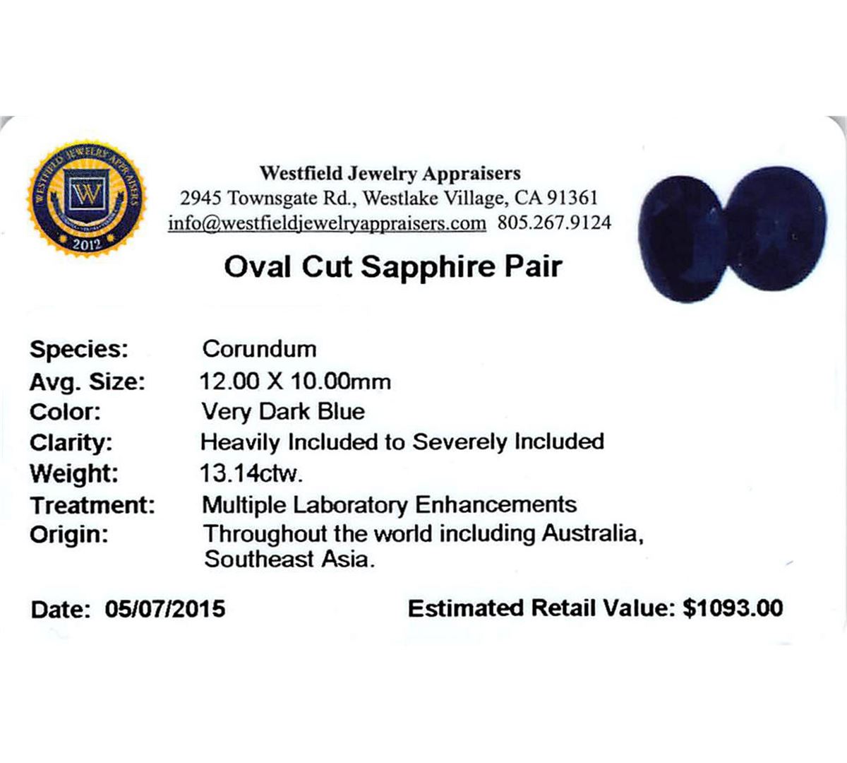 Two oval cut sapphires, measuring 12.00 x 10.00mm, approximate total weight of 13.14ct., clarity is heavily included to severely included, very dark blue color. Indications of multiple laboratory enhancements. Westfield Appraised at $1,093.00.