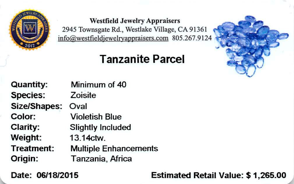 Forty oval mixed cut natural tanzanites exact total weight 13.14ct., clarity is slightly included, medium, very slightly grayish, violetish blue color, (GIA vB 5/3), cut is good. Measurements & the color grade are an average for the group, Color grade is an average for the group, Naturally occurring internal & external characteristics are present, Indications of laboratory high temperature heat treatment. Westfield Appraised at $1,265.00.