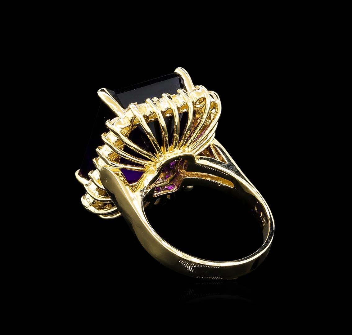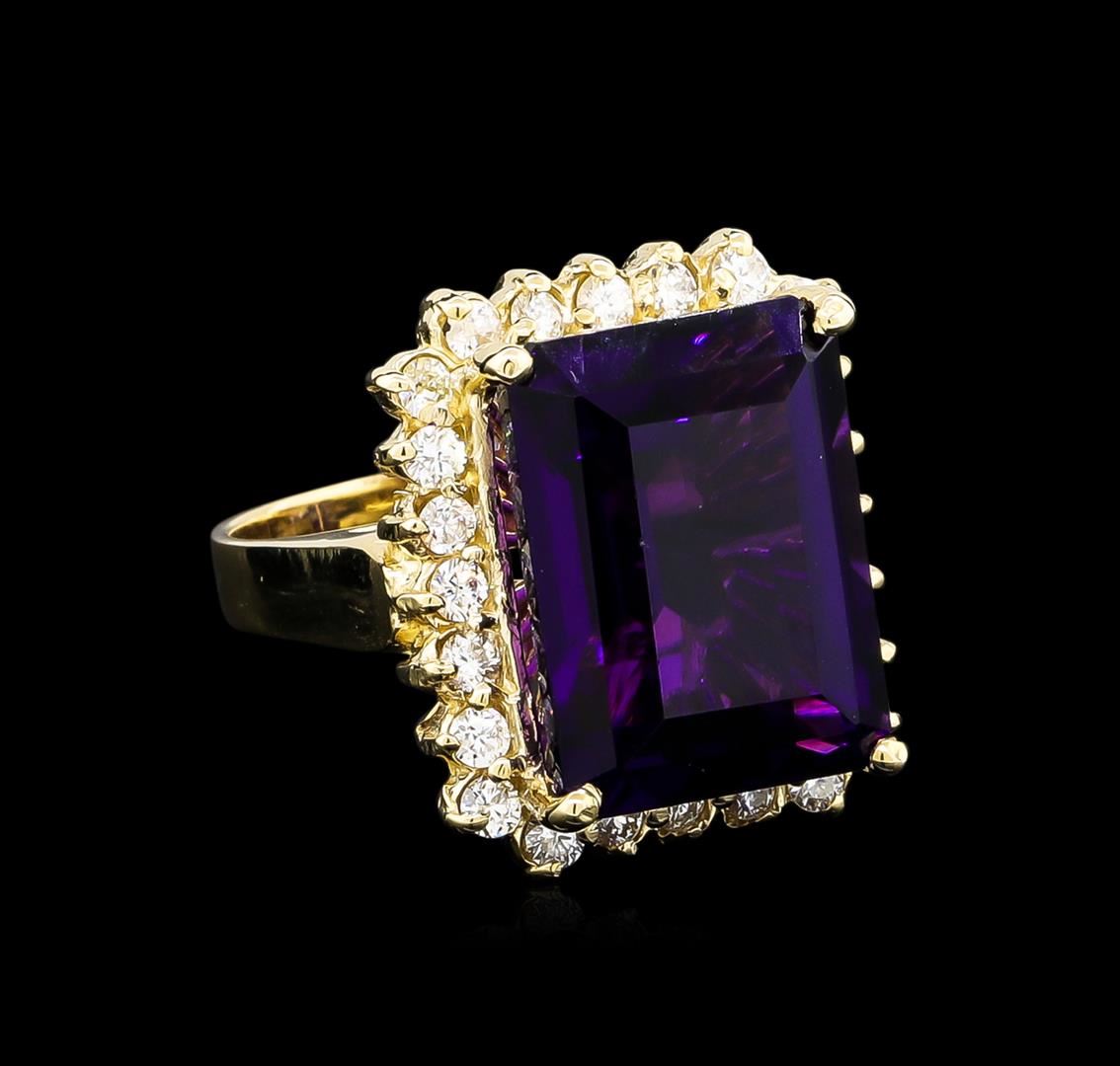 One electronically tested 14KT yellow gold lady's cast fashion ring with a basket halo with a bright polish finish. The featured lady's ring has a shank measuring 3.06 millimeters wide. Identified with markings of "14K". Condition is new, good workmanship. Containing: One prong set emerald modified step cut natural amethyst, measuring 15.87 x 11.95 x 8.75mm, 10%. bulge factor, approximate weight of 13.15ct., clarity is eye clean, type II, medium dark, moderately strong, purple color, (GIA P 6/4), cut is good. Transmitting light with no distortion, transparent. Colored gemstones are presumed to have been subjected to commonly used enhancement processes. Graded in the setting. Twenty-Four prong set round brilliant cut diamonds, measuring 2.10 - 2.00 x 1.27mm (depth est.) approximate total weight of 24 Stones = 0.78ct. Graded in the setting. Clarity: SI-1 to SI-2. Color: H - I. Cut Good. Total Weight of Colored Stones 13.15ct. Total Weight of Diamonds 0.78ct. Total Weight of Ring 10.30gm. GAS Appraised at $4,330.00.