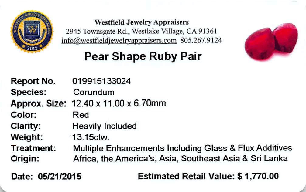 Two pear cut natural rubies, measuring 12.40 x 11.00 x 6.70mm, exact total weight 13.15ct., clarity is heavily included, type II, dark, very slightly brownish, red color, (GIA R 7/3), cut is good. Measurements are an average for the pair. Transmitting light somewhat diffusely, transparent to translucent. Naturally occurring internal & external characteristics are present. Indications of laboratory high temperature heat treatment, with glass & flux additives. Ruby has a low tolerance to rhodium plating, repolishing the surface, & ultrasonic cleaning. Westfield Appraised at $1,770.00.