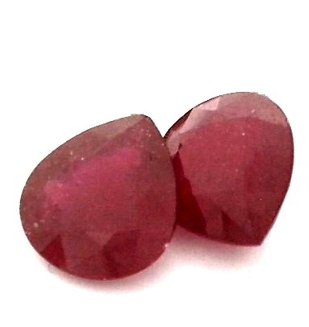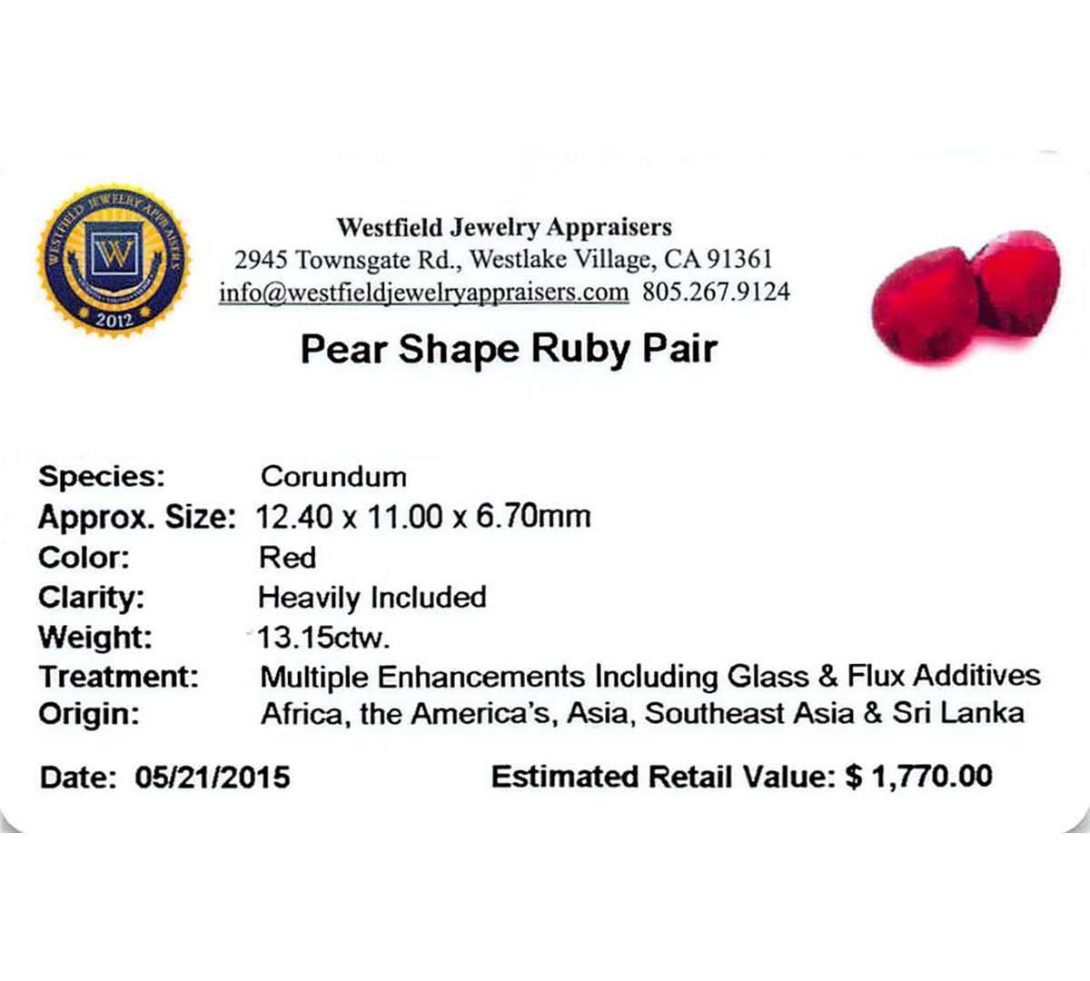 Two pear cut natural rubies, measuring 12.40 x 11.00 x 6.70mm, exact total weight 13.15ct., clarity is heavily included, type II, dark, very slightly brownish, red color, (GIA R 7/3), cut is good. Measurements are an average for the pair. Transmitting light somewhat diffusely, transparent to translucent. Naturally occurring internal & external characteristics are present. Indications of laboratory high temperature heat treatment, with glass & flux additives. Ruby has a low tolerance to rhodium plating, repolishing the surface, & ultrasonic cleaning. Westfield Appraised at $1,770.00.