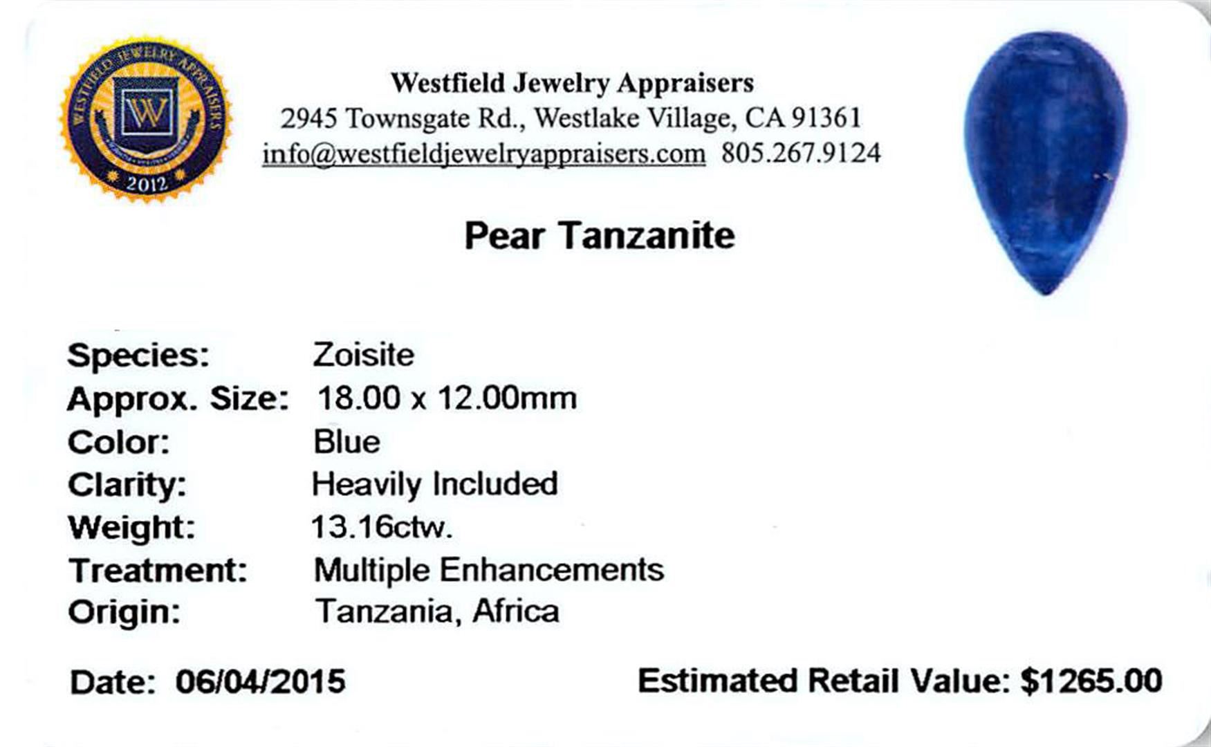 One pear cabochon cut natural tanzanite, measuring 18.00 x 12.00 x 7.00mm, exact total weight 13.16ct., clarity is heavily included, type I, dark, very slightly grayish, blue color, (GIA B 7/3), cut is good. Transmitting light somewhat diffusely, transparent to translucent. Naturally occurring internal & external characteristics are present. Indications of heat treatment. Westfield Appraised at $1,265.00.