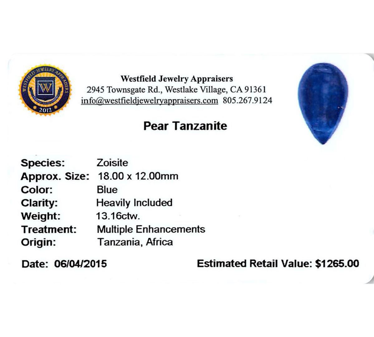 One pear cabochon cut natural tanzanite, measuring 18.00 x 12.00 x 7.00mm, exact total weight 13.16ct., clarity is heavily included, type I, dark, very slightly grayish, blue color, (GIA B 7/3), cut is good. Transmitting light somewhat diffusely, transparent to translucent. Naturally occurring internal & external characteristics are present. Indications of heat treatment. Westfield Appraised at $1,265.00.