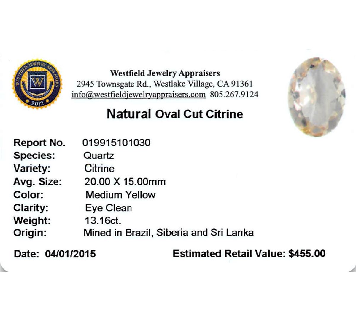 One oval cut natural citrine quartz exact weight 13.16ct., clarity is eye clean, type I, medium, slightly brownish, yellowish orange color, (GIA yO 5/2), cut is good. Westfield Appraised at $455.00.