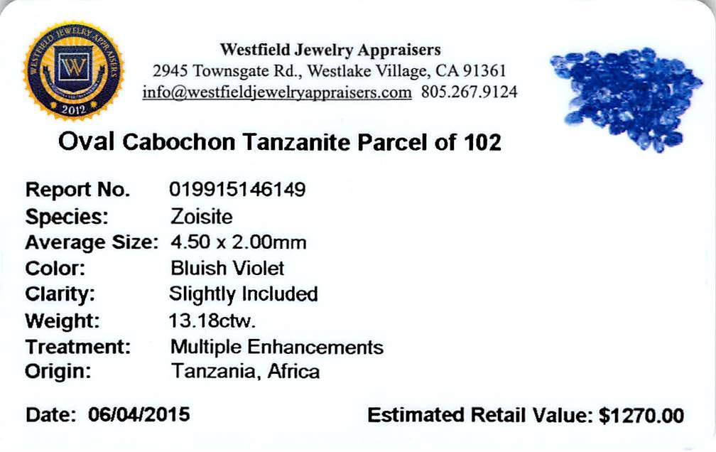 One hundred two oval mixed cut natural tanzanites, measuring 4.50 x 2.00 x 1.30mm, exact total weight 13.18ct., clarity is slightly included, type I, medium, very slightly grayish, bluish violet color, (GIA bV 5/3), cut is good. Transmitting light with a minimum of distortion, transparent, Naturally occurring internal & external characteristics are present. Measurements & the color grade are an average for the group. Tanzanite is a very rare gemstone that is only found in the country of Tanzania. Originally discovered in 1967. Tiffany & Company, named the stone Tanzanite. It is found in the Usumburu Mountains that border the Umba Valley of northern Tanzania. Tanzanite occurs in gray, brown, violet, blue, reddish-purple, & green. The gem is interesting because of its exceptional pleochroism. Rotated in different directions a tanzanite will exhibit multiple changes of color. Tanzanite has a low tolerance to ultrasonic cleaning, and should not be cleaned using this method. Westfield Appraised at $1,270.00.