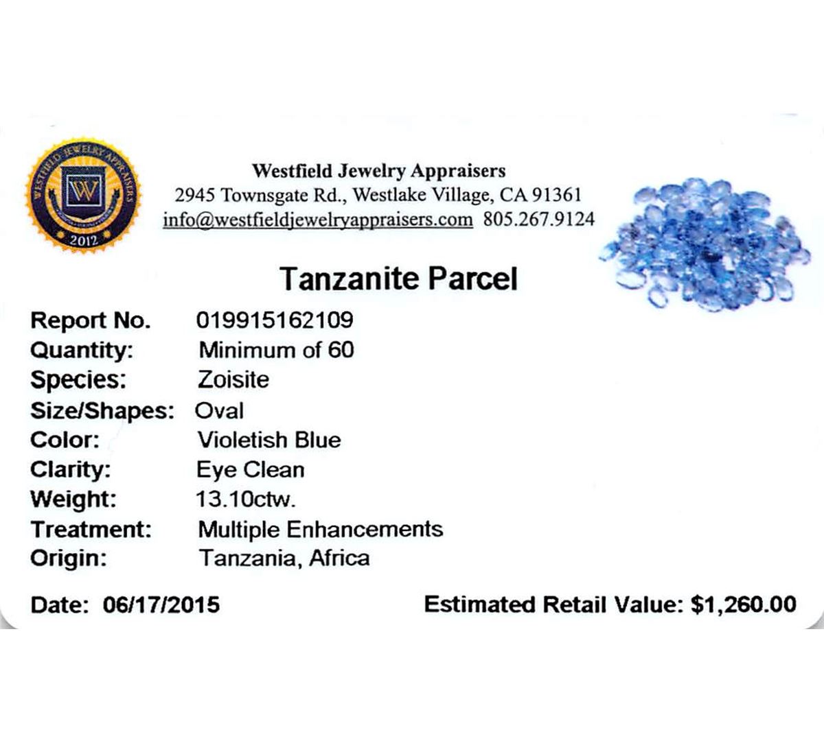 Sixty oval mixed cut natural tanzanites exact total weight 13.10ct., clarity is slightly included, type I, medium dark, very slightly grayish, violetish blue color, (GIA vB 6/3), cut is good. Measurements & the color grade are an average for the group, Color grade is an average for the group, Transmitting light with no distortion, transparent, Indications of laboratory high temperature heat treatment. Westfield Appraised at $1,260.00.