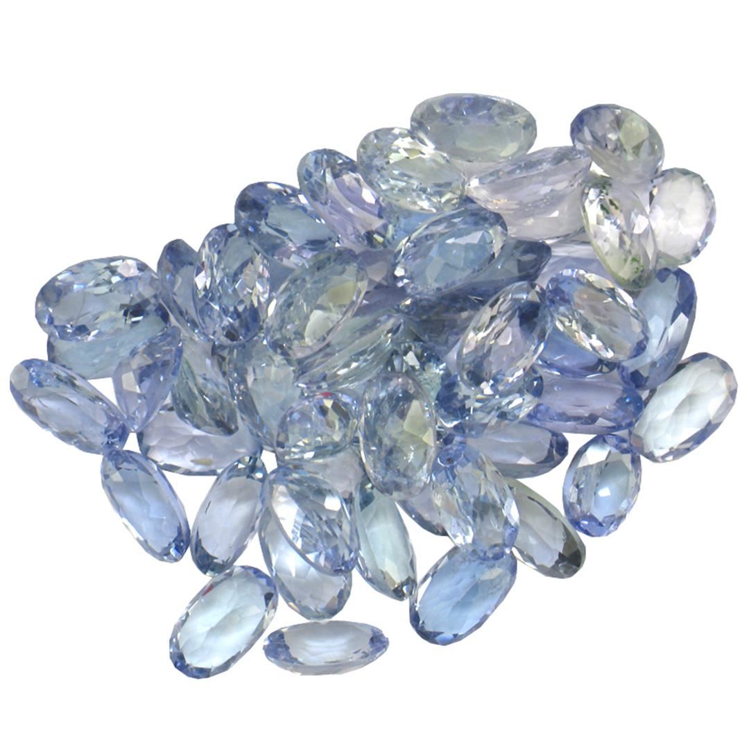 Fifty-six oval mixed cut natural tanzanites, measuring 5.00 x 3.00 x 1.95mm, exact total weight 13.10ct., clarity is slightly included, type I, medium, very slightly grayish, bluish violet color, (GIA bV 5/3), cut is good. Transmitting light with a minimum of distortion, transparent. Naturally occurring internal & external characteristics are present. Measurements & the color grade are an average for the group. Tanzanite is a very rare gemstone that is only found in the country of Tanzania. Originally discovered in 1967. Tiffany & Company, named the stone Tanzanite. It is found in the Usumburu Mountains that border the Umba Valley of northern Tanzania. Tanzanite occurs in gray, brown, violet, blue, reddish-purple, & green. The gem is interesting because of its exceptional pleochroism. Rotated in different directions a tanzanite will exhibit multiple changes of color. Tanzanite has a low tolerance to ultrasonic cleaning, and should not be cleaned using this method. Westfield Appraised at $1,260.00.