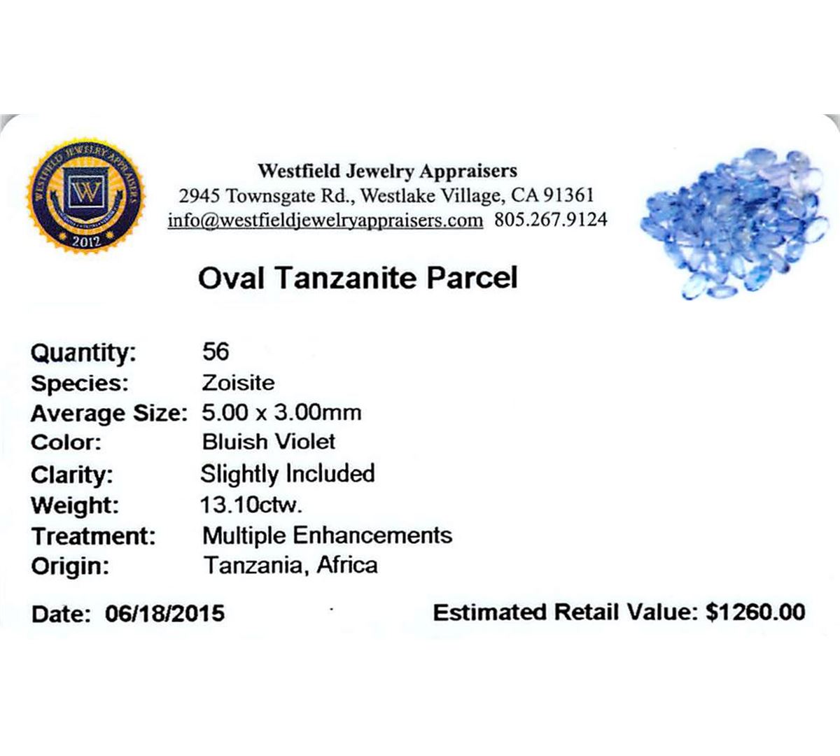 Fifty-six oval mixed cut natural tanzanites, measuring 5.00 x 3.00 x 1.95mm, exact total weight 13.10ct., clarity is slightly included, type I, medium, very slightly grayish, bluish violet color, (GIA bV 5/3), cut is good. Transmitting light with a minimum of distortion, transparent. Naturally occurring internal & external characteristics are present. Measurements & the color grade are an average for the group. Tanzanite is a very rare gemstone that is only found in the country of Tanzania. Originally discovered in 1967. Tiffany & Company, named the stone Tanzanite. It is found in the Usumburu Mountains that border the Umba Valley of northern Tanzania. Tanzanite occurs in gray, brown, violet, blue, reddish-purple, & green. The gem is interesting because of its exceptional pleochroism. Rotated in different directions a tanzanite will exhibit multiple changes of color. Tanzanite has a low tolerance to ultrasonic cleaning, and should not be cleaned using this method. Westfield Appraised at $1,260.00.