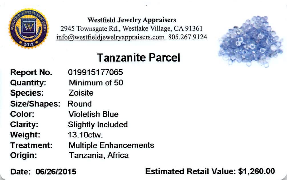 Fifty round mixed cut natural tanzanites, measuring 2.00 - 2.00 x 1.30 mm, exact total weight 13.10ct., clarity is slightly included, type I, medium light, very slightly grayish, violetish blue color, (GIA vB 4/3), cut is good. Measurements & the color grade are an average for the group, Color grade is an average for the group, Transmitting light with no distortion, transparent, Naturally occurring internal & external characteristics are present, Indications of multiple laboratory enhancements, including high temperature heat treatment. Westfield Appraised at $1,260.00.