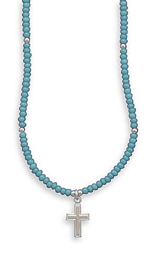 13" + 2" extension sterling silver turquoise glass bead necklace with cross charm. Cross measures 10mm x 7mm. .925 Sterling Silver