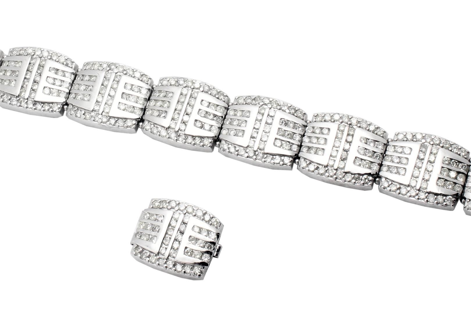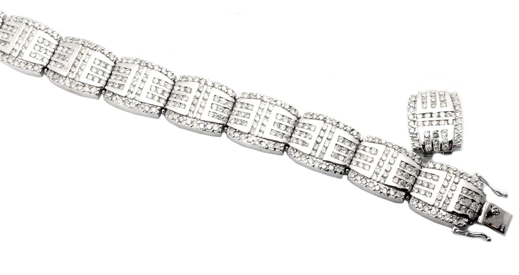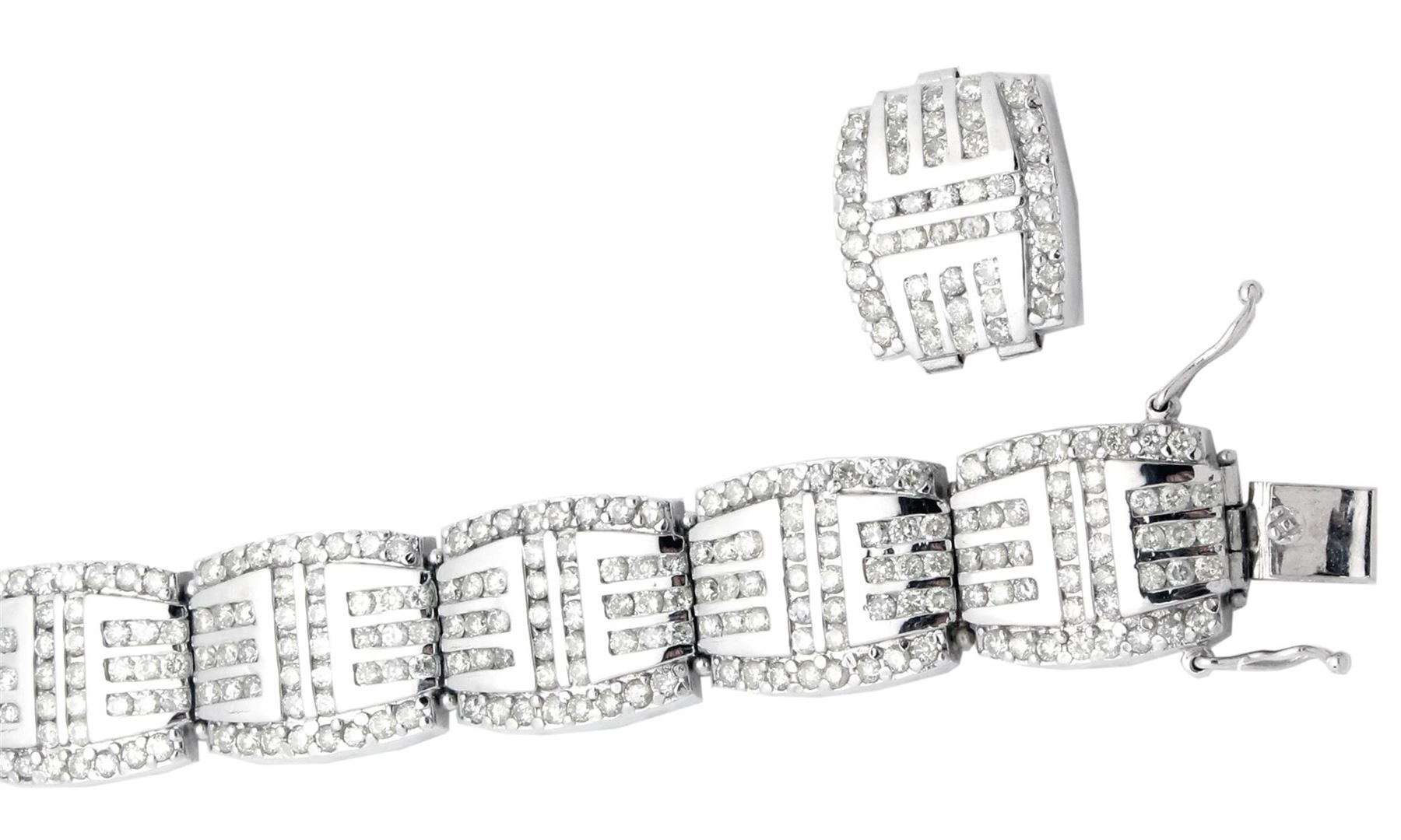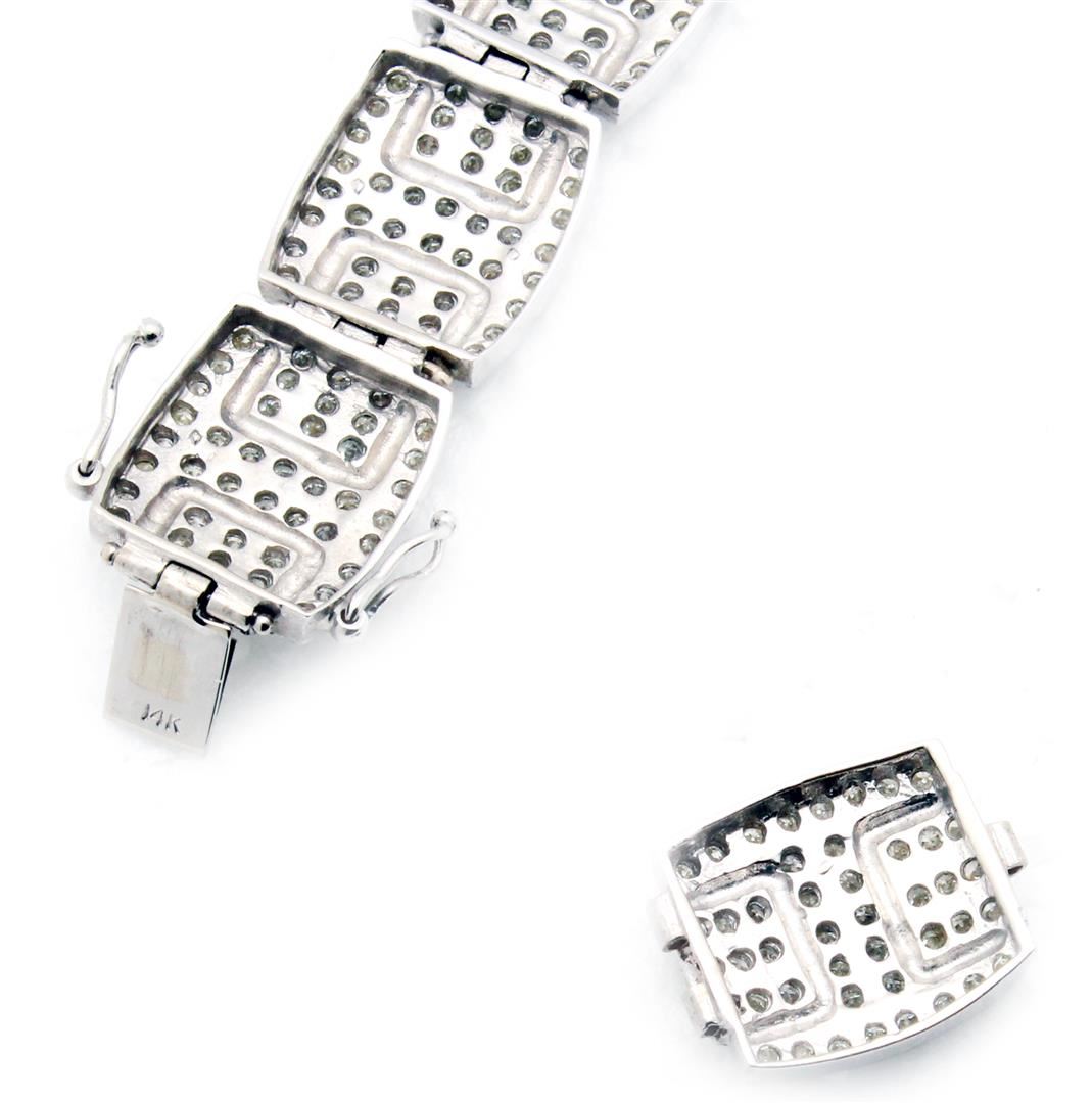 One electronically tested 14KT white gold ladies cast bracelet with a hidden box clasp with safety closer with a bright polish finish. Measurements: 8" in length Identified with markings of "14K". Length can be adjusted by simply removing a piece. Condition is pre-owned. Center Bracelet set with 280 channel setting with round cut natural diamonds, measuring 2.1mm,approximate total weight of 7.6 ct. Clarity: SI-2. Color: H - I, Cut is Good. 160 prong set round brilliant cut diamonds, measuring 2.1mm. approximate total weight of 5.6ct. Clarity: SI-1. Color: H-I, Cut is Good. All diamonds are graded in the mounting, unless otherwise stated. Total Weight of Diamonds 13.2ct. Total Weight of Bracelet 55 grams.