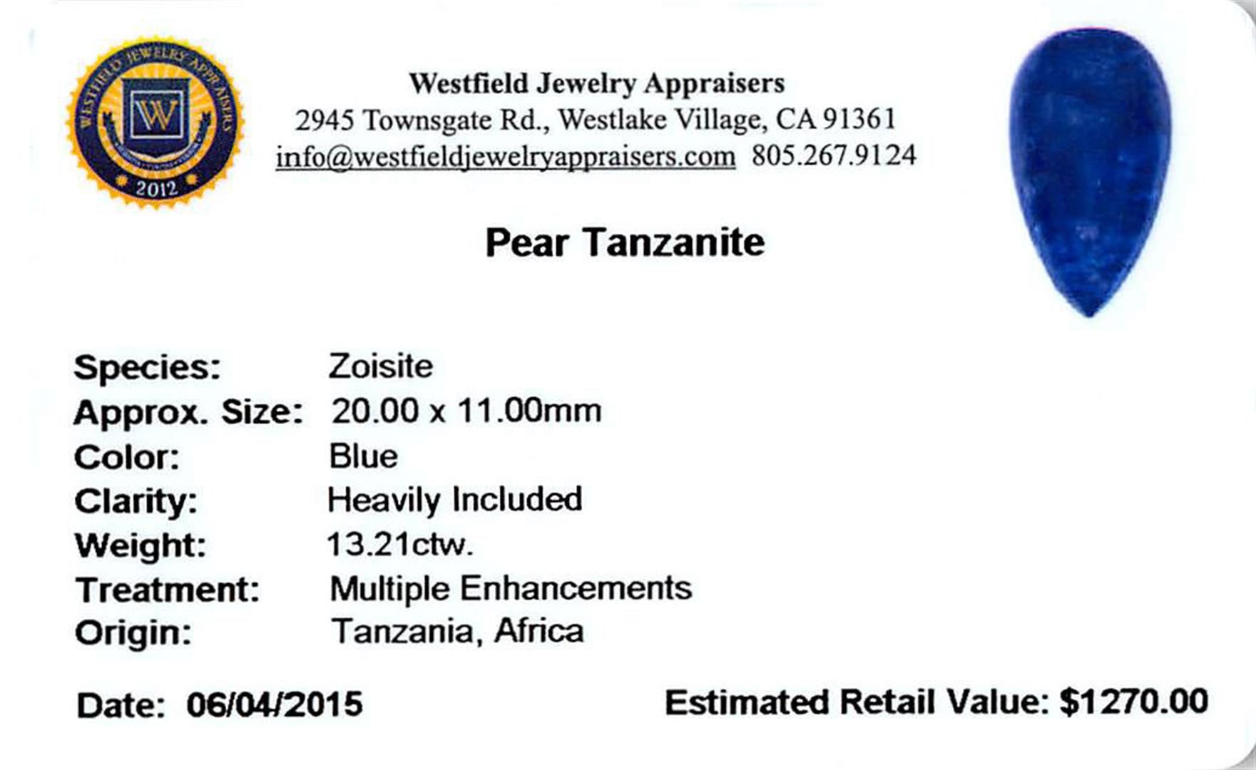 One pear cabochon cut natural tanzanite, measuring 20.00 x 11.00 x 7.00mm, exact weight 13.21ct., clarity is heavily included, type I, dark, very slightly grayish, violetish blue color, (GIA vB 7/3), cut is good. transmitting light somewhat diffusely, transparent to translucent. Naturally occurring internal & external characteristics are present. Indications of heat treatment. Westfield Appraised at $1,270.00.