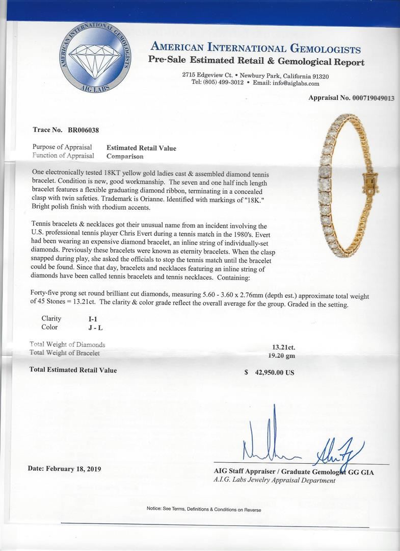 One 13.21ctw Diamond Bracelelet - 18KT Yellow Gold. AIG certified. See Appraisal for more details. AIG Appraised.