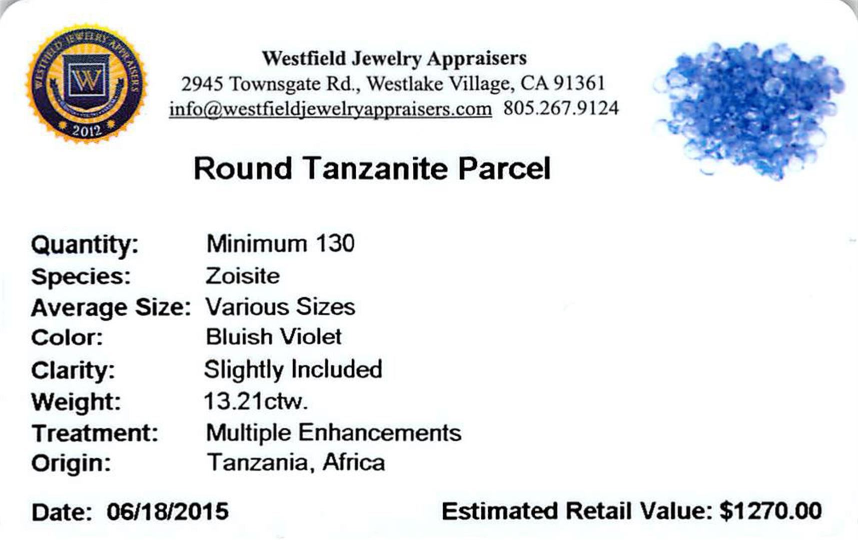 One hundred thirty round mixed cut natural tanzanites exact total weight 13.21ct., clarity is slightly included, type I, medium dark, very slightly grayish, bluish violet color, (GIA bV 6/3), cut is good. Transmitting light with a minimum of distortion, transparent. Naturally occurring internal & external characteristics are present. Color grade is an average for the group. Tanzanite is a very rare gemstone that is only found in the country of Tanzania. Originally discovered in 1967. Tiffany & Company, named the stone Tanzanite. It is found in the Usumburu Mountains that border the Umba Valley of northern Tanzania. Tanzanite occurs in gray, brown, violet, blue, reddish-purple, & green. The gem is interesting because of its exceptional pleochroism. Rotated in different directions a tanzanite will exhibit multiple changes of color. Tanzanite has a low tolerance to ultrasonic cleaning, and should not be cleaned using this method. Westfield Appraised at $1,270.00.