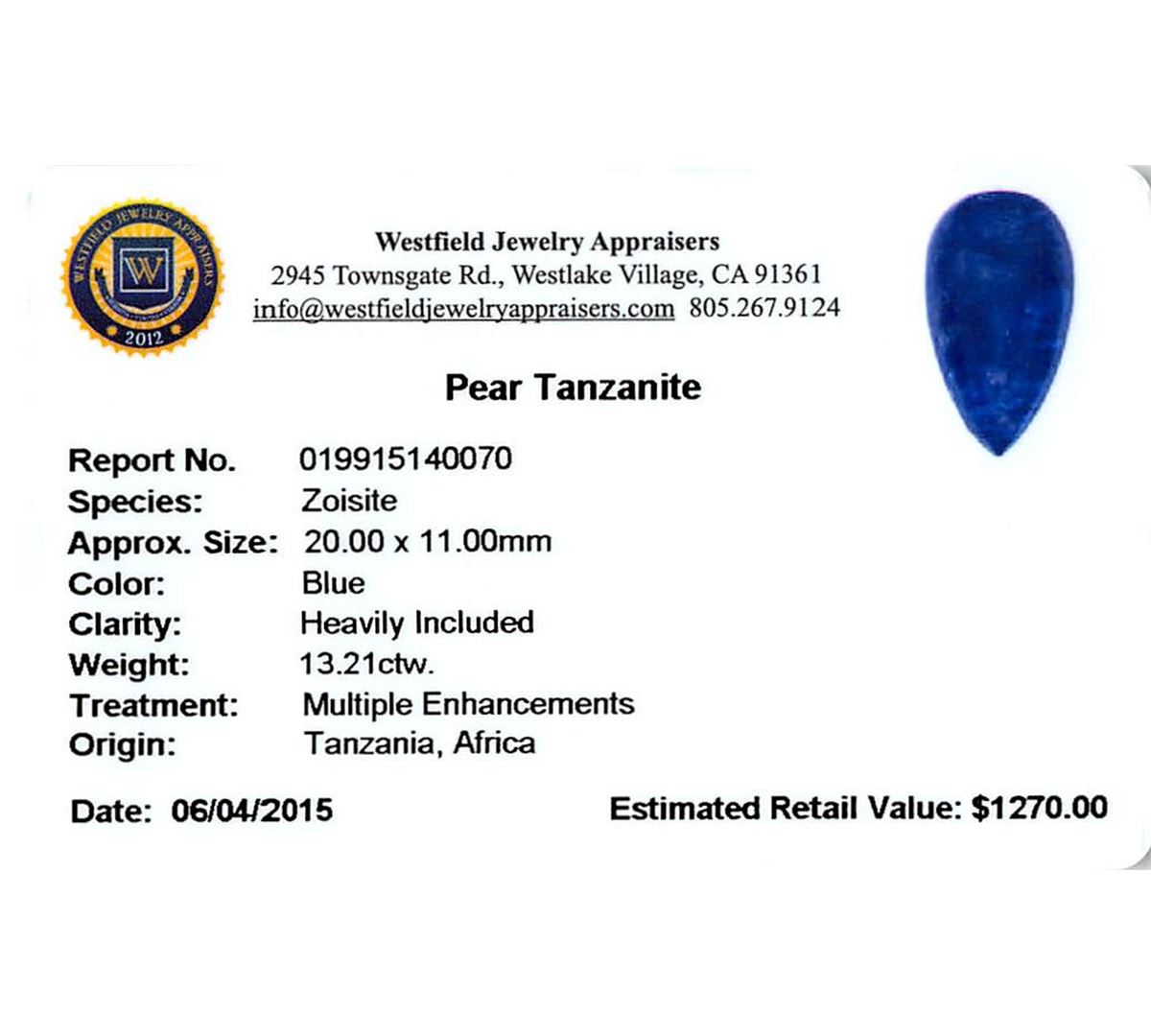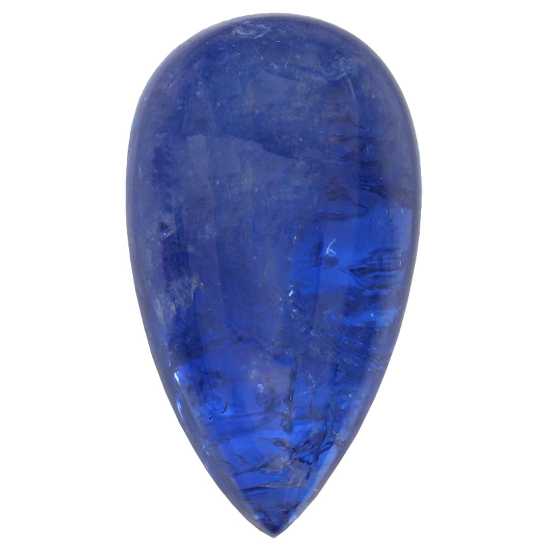 One pear cabochon cut natural tanzanite, measuring 20.00 x 11.00 x 7.00mm, exact weight 13.21ct., clarity is heavily included, type I, dark, very slightly grayish, violetish blue color, (GIA vB 7/3), cut is good. transmitting light somewhat diffusely, transparent to translucent. Naturally occurring internal & external characteristics are present. Indications of heat treatment. Westfield Appraised at $1,270.00.