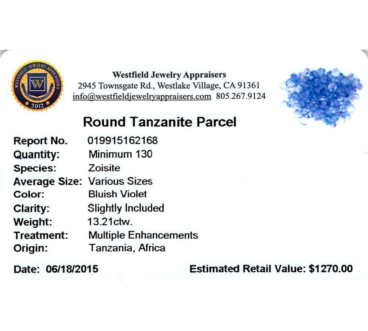 One hundred thirty round mixed cut natural tanzanites exact total weight 13.21ct., clarity is slightly included, type I, medium dark, very slightly grayish, bluish violet color, (GIA bV 6/3), cut is good. Transmitting light with a minimum of distortion, transparent. Naturally occurring internal & external characteristics are present. Color grade is an average for the group. Tanzanite is a very rare gemstone that is only found in the country of Tanzania. Originally discovered in 1967. Tiffany & Company, named the stone Tanzanite. It is found in the Usumburu Mountains that border the Umba Valley of northern Tanzania. Tanzanite occurs in gray, brown, violet, blue, reddish-purple, & green. The gem is interesting because of its exceptional pleochroism. Rotated in different directions a tanzanite will exhibit multiple changes of color. Tanzanite has a low tolerance to ultrasonic cleaning, and should not be cleaned using this method. Westfield Appraised at $1,270.00.