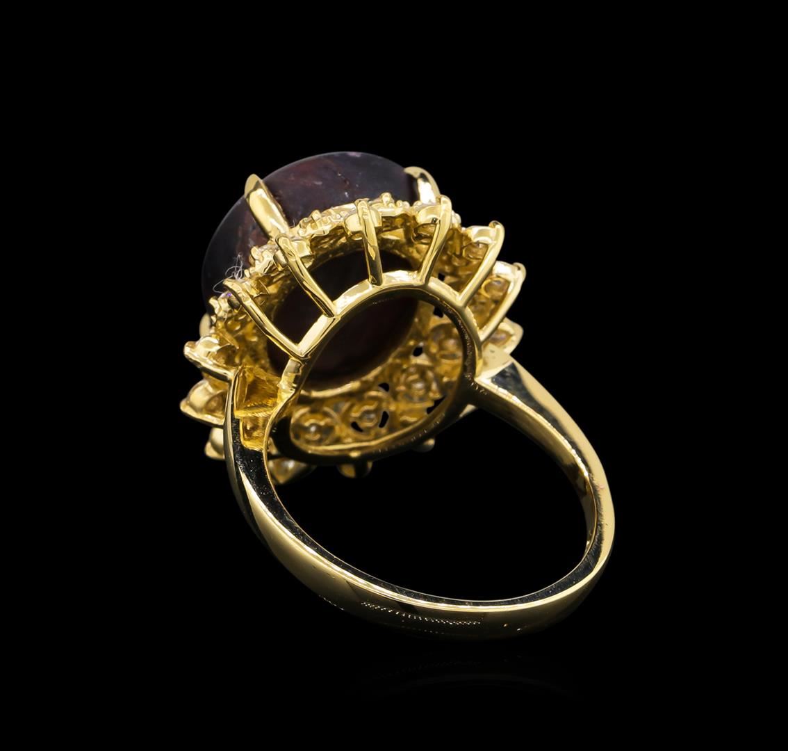 One ring featuring: 14KT yellow gold weighing 5.06 grams containing one ruby with a total weight of 13.22ct and side diamonds with a total weight of 0.53ct.