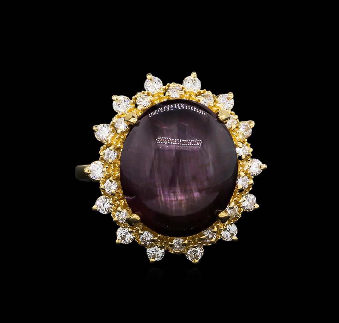 One ring featuring: 14KT yellow gold weighing 5.06 grams containing one ruby with a total weight of 13.22ct and side diamonds with a total weight of 0.53ct.