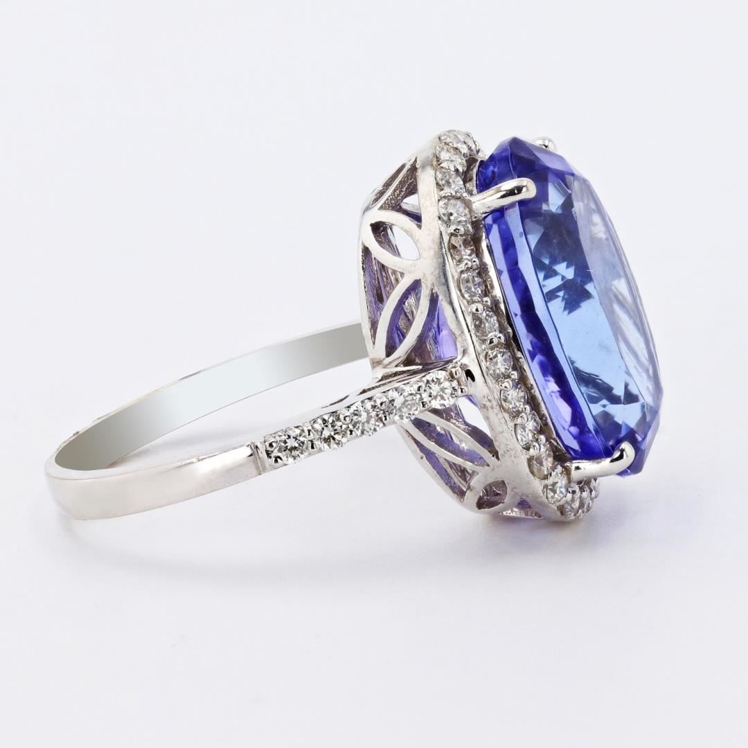 One polished. stamped. and tested 18K white gold ring with a bright finish. The ring is mounted with: 1 genuine tanzanite center stone weighing approximately 13.24 carat. and 38 genuine round diamonds weighing approximately 0.60 carats. This item weighs 8.0 grams. condition is new, excellent workmanship. #MAIN GEMSTONE# Species: Natural Zoisite Variety: Tanzanite Shape: Oval Cutting Style: Brilliant Cut Crown, Modified Brilliant Cut Pavilion Measurements: 16.5 x 12.5mm Weight: 13.24 carat Color: Violetish Blue Cut Grade: Very Good Refractive Index: 1.691 - 1.700 DR Birefringence: 0.008 - 0.013 Hardness: 6.5 - 7 #ADJACENT GEMSTONES ON RING# Identity: Natural Diamond Shape: Round Cutting Style: Brilliant Cut Quantity: 38 Diamonds Measurements: 1.5 - 1.8mm Total Weight: 0.60 carats Clarity Grade: VS2-SI1 Color Grade: G-H Refractive Index: 2.418 Hardness: 10 TANZANITE WEIGHT: 13.24 ct TOTAL DIAMOND WEIGHT: 0.60 cts WEIGHT OF ITEM: 8.0 grams GOLD CONTENT: 18K White Gold Size: 6 1/4
