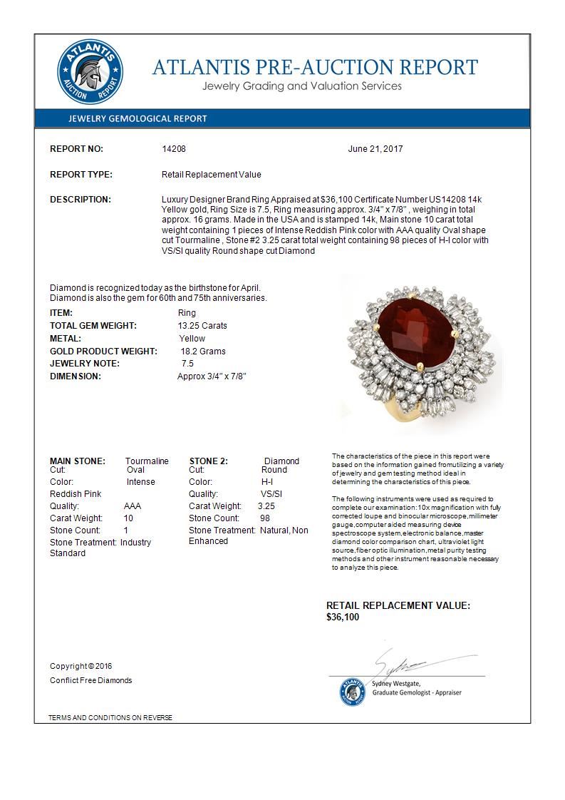 13.25 CTW Pink Tourmaline & Diamond Ring 14K Yellow Gold ---- Luxury Designer Brand Ring Appraised Retail Price at $36,100 ---- SKU Number US14208 14k Yellow gold Ring Size is 7.5, Ring measuring approx. 3/4" x 7/8" , weighing in total approx. 16 grams. Made in the USA and is stamped 14k, Main stone 10 carat total weight containing 1 pieces of Intense Reddish Pink color with AAA quality Oval shape cut Tourmaline , Stone #2 3.25 carat total weight containing 98 pieces of H-I color with VS/SI quality Round shape cut