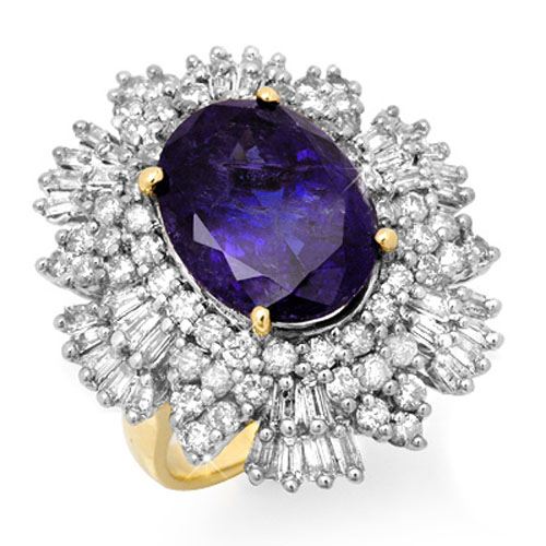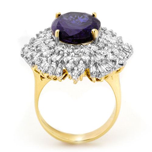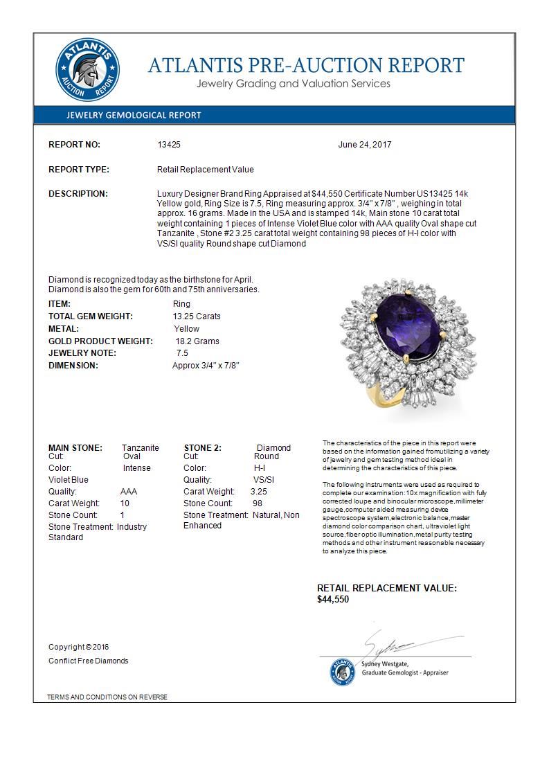 13.25 CTW Tanzanite & Diamond Ring 14K Yellow Gold ---- Luxury Designer Brand Ring Appraised Retail Price at $44,550  ---- SKU Number US13425 14k Yellow gold Ring Size is 7.5, Ring measuring approx. 3/4" x 7/8" , weighing in total approx. 16 grams. Made in the USA and is stamped 14k, Main stone 10 carat total weight containing 1 pieces of Intense Violet Blue color with AAA quality Oval shape cut Tanzanite , Stone #2 3.25 carat total weight containing 98 pieces of H-I color with VS/SI quality Round shape cut