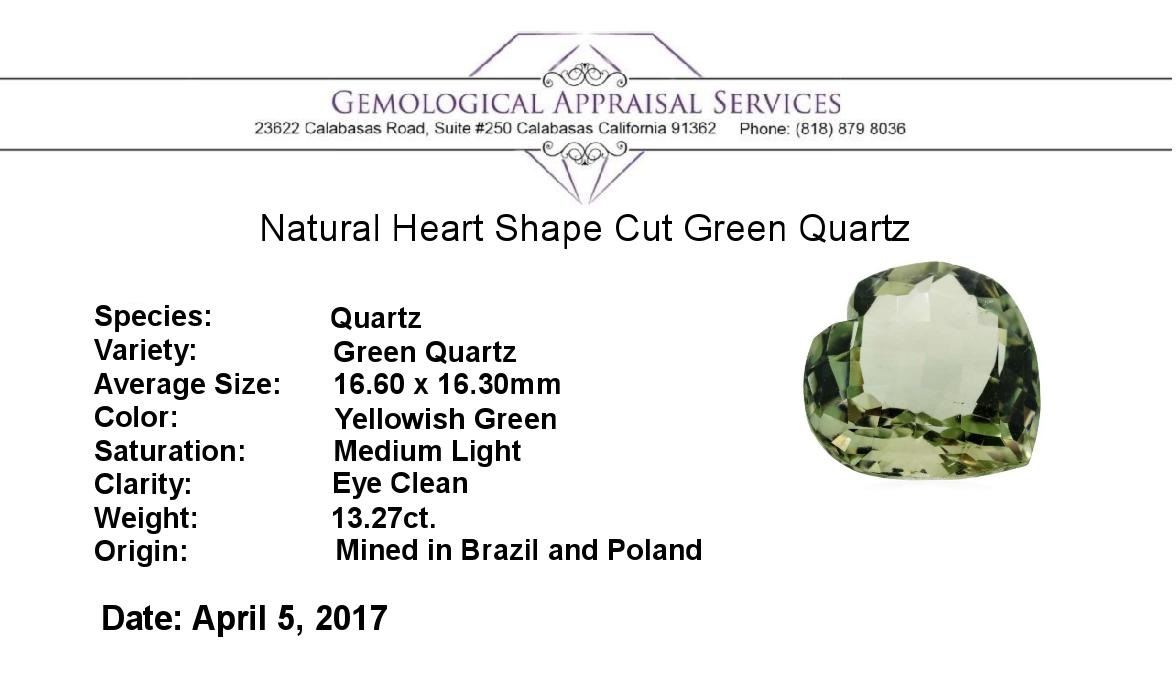 One natural heart shape cut green quartz with an exact weight of 13.27ct., clarity is eye clean, yellowish green, medium light. Gemological Appraisals Services estimates the retail value at $464.45 GAS Appraised.