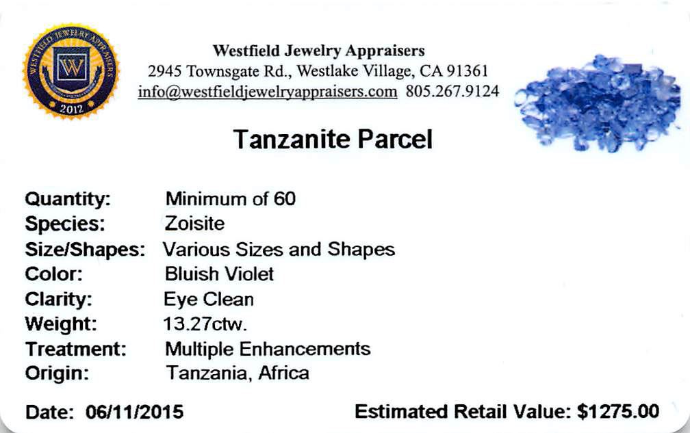 Sixty mixed cut natural tanzanites exact total weight 13.27ct., clarity is eye clean, type I, medium dark, very slightly grayish, bluish violet color, (GIA bV 6/3), cut is good. Transmitting light with no distortion, transparent. Color grade is an average for the group. Graded in the setting. Tanzanite is a very rare gemstone that is only found in the country of Tanzania. Originally discovered in 1967. Tiffany & Company, named the stone Tanzanite. It is found in the Usumburu Mountains that border the Umba Valley of northern Tanzania. Tanzanite occurs in gray, brown, violet, blue, reddish-purple, & green. The gem is interesting because of its exceptional pleochroism. Rotated in different directions a tanzanite will exhibit multiple changes of color. Tanzanite has a low tolerance to ultrasonic cleaning, and should not be cleaned using this method. Westfield Appraised at $1,275.00.