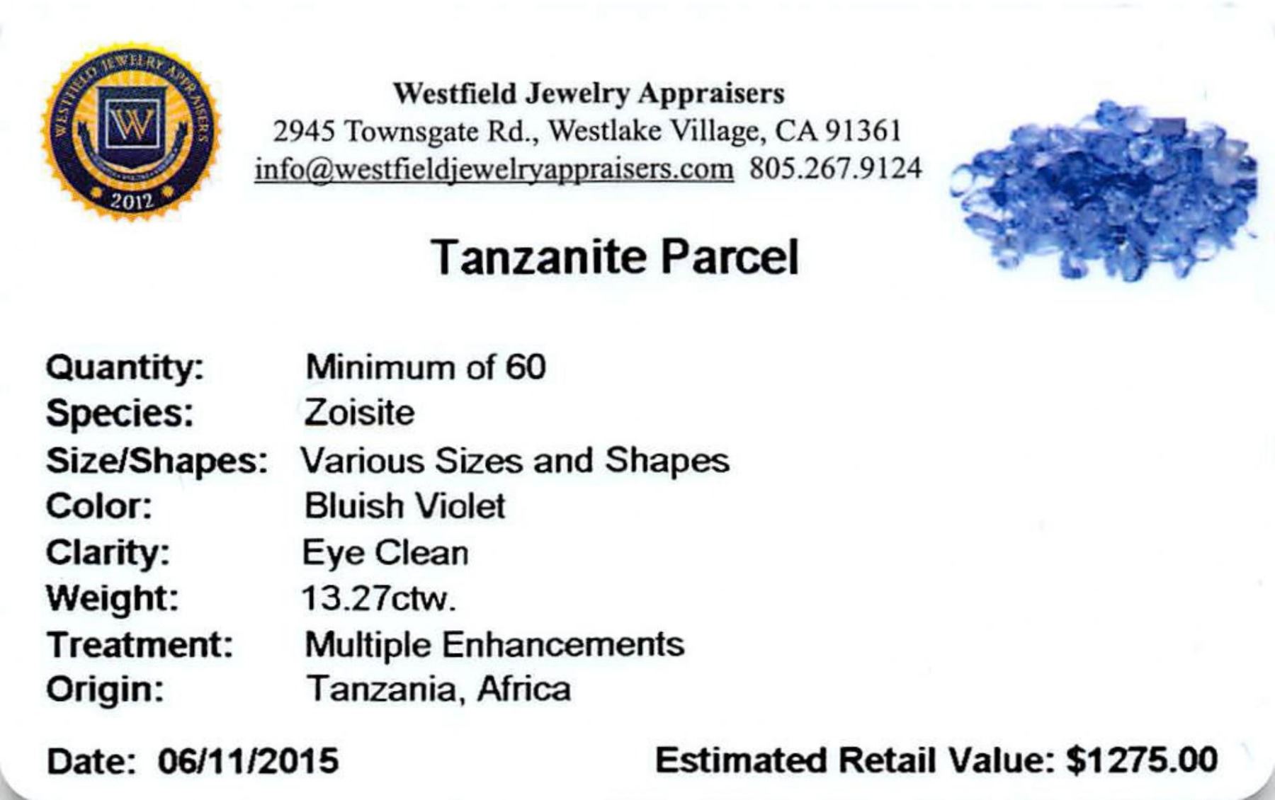 Sixty mixed cut natural tanzanites exact total weight 13.27ct., clarity is eye clean, type I, medium dark, very slightly grayish, bluish violet color, (GIA bV 6/3), cut is good. Transmitting light with no distortion, transparent. Color grade is an average for the group. Graded in the setting. Tanzanite is a very rare gemstone that is only found in the country of Tanzania. Originally discovered in 1967. Tiffany & Company, named the stone Tanzanite. It is found in the Usumburu Mountains that border the Umba Valley of northern Tanzania. Tanzanite occurs in gray, brown, violet, blue, reddish-purple, & green. The gem is interesting because of its exceptional pleochroism. Rotated in different directions a tanzanite will exhibit multiple changes of color. Tanzanite has a low tolerance to ultrasonic cleaning, and should not be cleaned using this method. Westfield Appraised at $1,275.00.