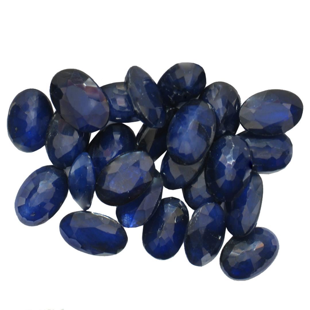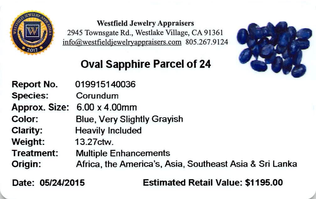 Twenty-four oval mixed cut natural blue sapphires, measuring 6.00 x 4.00 x 0.00mm, exact total weight 13.27ct., clarity is heavily included, type II, dark, very slightly grayish, blue color, (GIA B 7/3), cut is good. Indications of multiple laboratory enhancements, including high temperature heat treatment. Westfield Appraised at $1,195.00.