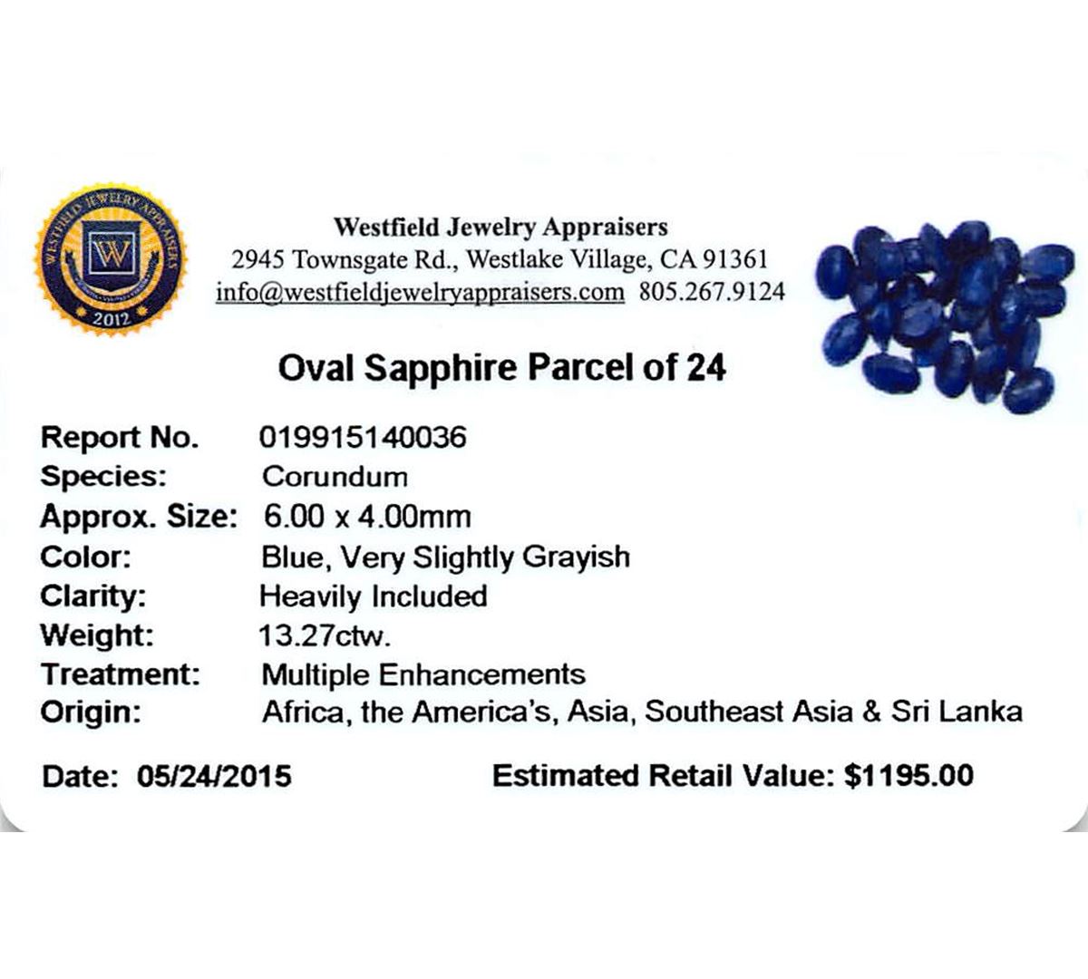 Twenty-four oval mixed cut natural blue sapphires, measuring 6.00 x 4.00 x 0.00mm, exact total weight 13.27ct., clarity is heavily included, type II, dark, very slightly grayish, blue color, (GIA B 7/3), cut is good. Indications of multiple laboratory enhancements, including high temperature heat treatment. Westfield Appraised at $1,195.00.