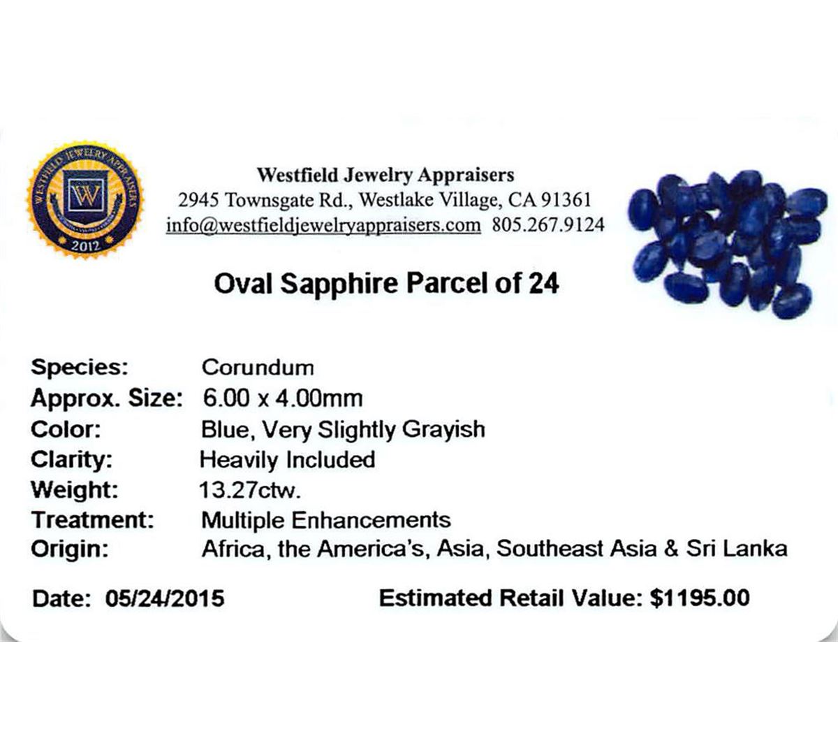 Twenty-four oval mixed cut natural blue sapphires, measuring 6.00 x 4.00 x 0.00mm, exact total weight 13.27ct., clarity is heavily included, type II, dark, very slightly grayish, blue color, (GIA B 7/3), cut is good. Indications of multiple laboratory enhancements, including high temperature heat treatment. Westfield Appraised at $1,195.00.