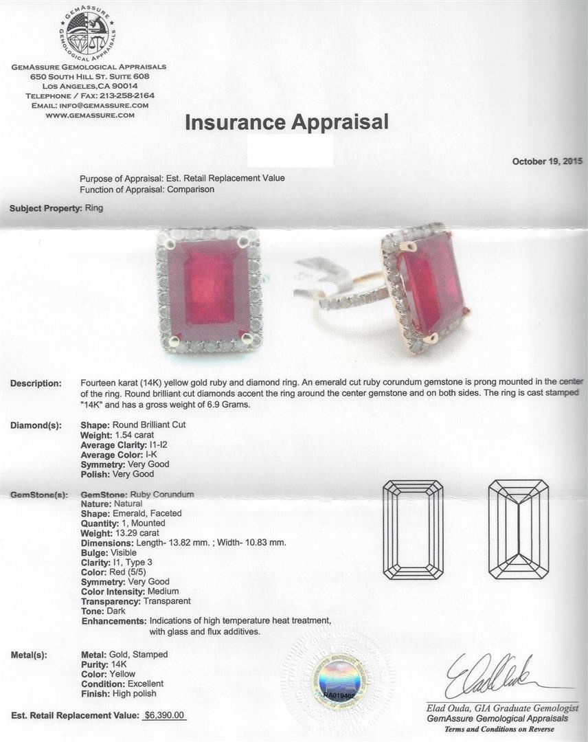 Fourteen karat (14K) yellow gold ruby and diamond ring. An emerald cut ruby corundum gemstone is prong mounted in the center of the ring. Round brilliant cut diamonds accent the ring around the center gemstone and on both sides. The ring is cast stamped "14K" and has a gross weight of 6.9 Grams. Diamond(s): Shape: Round Brilliant Cut. Weight: 1.54 carat. Average Clarity: I1-I2. Average Color: I-K. Symmetry: Very Good. Polish: Very Good. Gemstone(s): GemStone: Ruby Corundum. Nature: Natural. Shape: Emerald, Faceted. Quantity: 1, Mounted. Weight 13.29 carat. Dimensions: Length-13.82 mm. ; Width- 10.83 mm. Bulge: Visible. Clarity: I1, Type 3. Color: Red (5/5). Symmetry: Very Good. Color Intensity: Medium. Transparency: Transparent. Tone: Dark. Enhancements: Indications of high temperature heat treatment, with glass and flux additives. Metal(s): Metal: Gold, Stamped. Purity: 14K. Color: Yellow. Condition: Excellent. Finish: High polish. GGA Appraised.