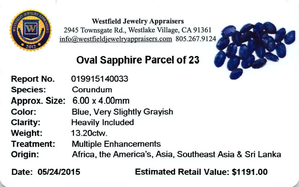 Twenty-three oval mixed cut natural blue sapphires, measuring 6.00 x 4.00 x 2.60mm, exact total weight 13.20ct., clarity is heavily included, type II, dark, very slightly grayish, blue color, (GIA B 7/3), cut is good. Indications of multiple laboratory enhancements, including high temperature heat treatment. Westfield Appraised at $1,190.73.