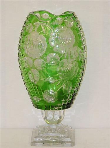 13 3/4" GREEN CUT TO CLEAR PILLOW VASE ON STEPPED BASE W/ ROSES DECORATION, UNSIGNED (POSSIBLY VAL ST. LAMBERT)