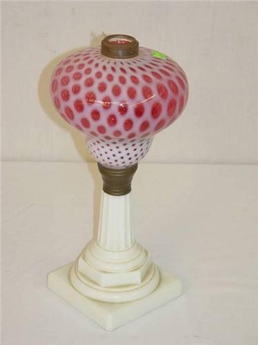13 3/4" OIL LAMP W/ CRANBERRY OPALESCENT COINSPOT FONT ON MILKGLASS BASE - NO BURNER;