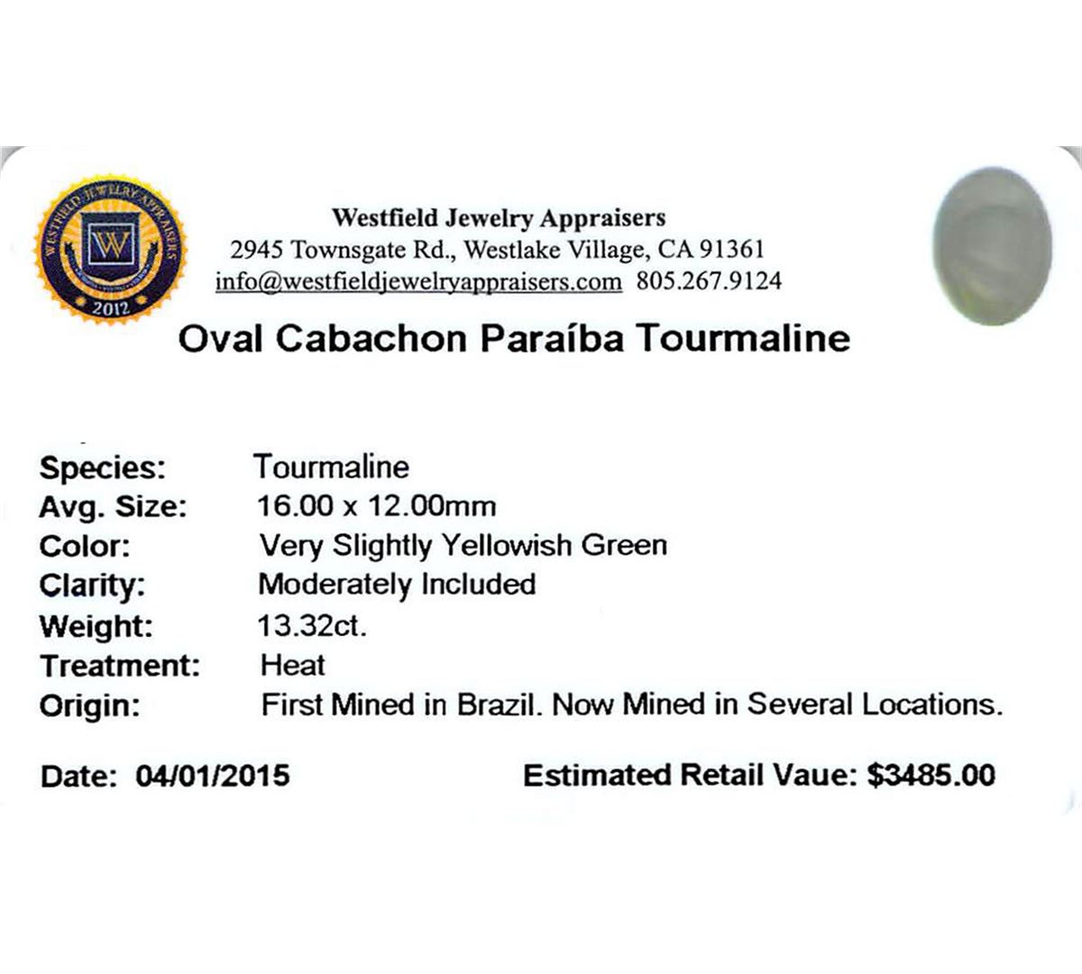 One oval cabochon cut natural Paraiba tourmaline exact weight 13.32ct., clarity is moderately included, cut is good. Westfield Appraised at $3,485.00.