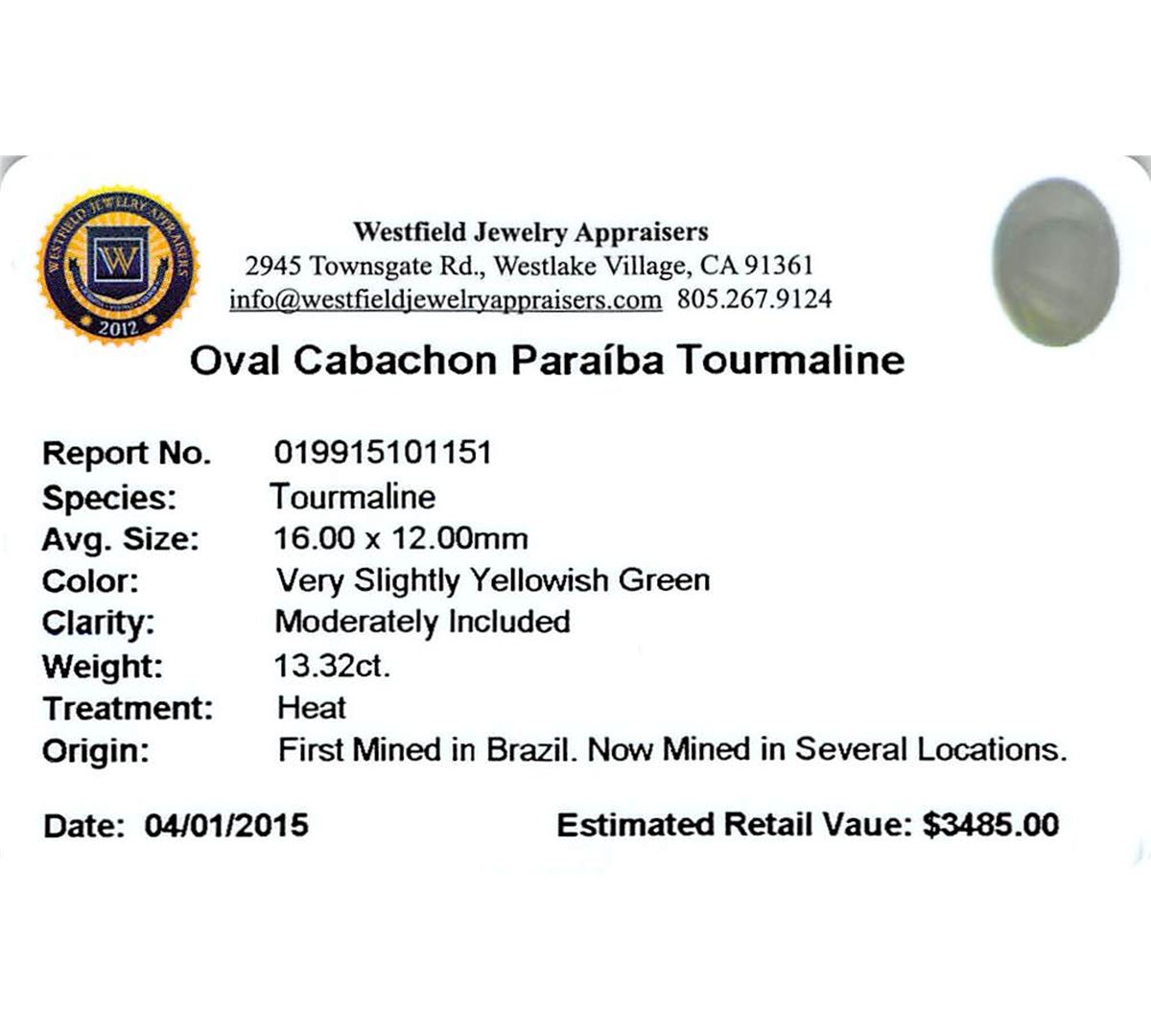 One oval cabochon cut natural Paraiba tourmaline exact weight 13.32ct., clarity is moderately included, cut is good. Westfield Appraised at $3,485.00.